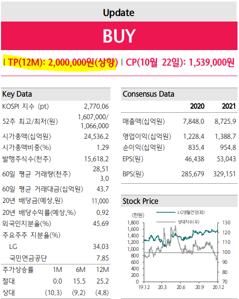 LG생활건강의 매출은 매년 우상향하고 있고 작년부터 애널리스트들은 목표주가 200만원을 제시했습니다.