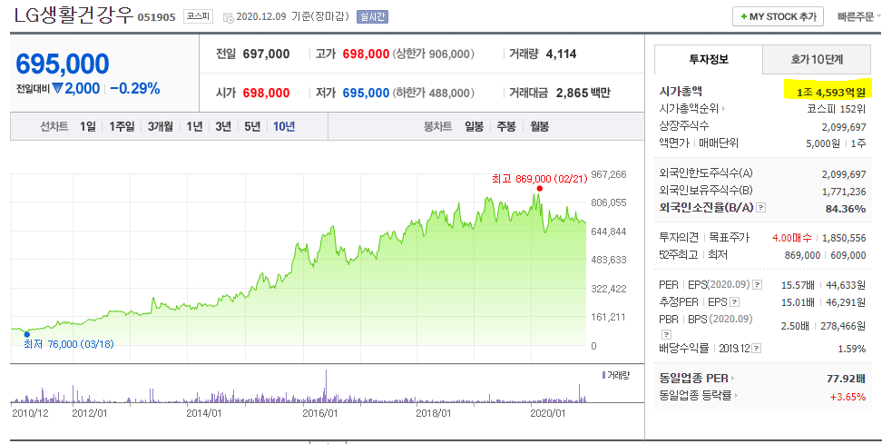 작년 12월 9일 LG생활건강우 주가는 69만원이었습니다