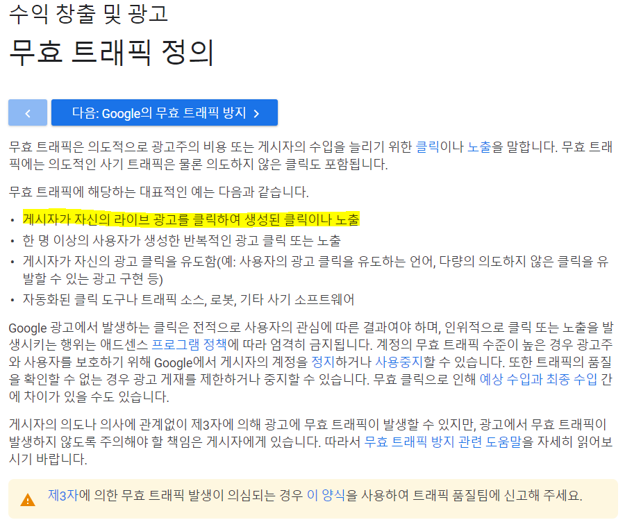 내가 쓴 포스팅에 달린 광고를 클릭을 며칠동안 해봤는데 이런 행위가 바로 무효 트래픽이었음..
