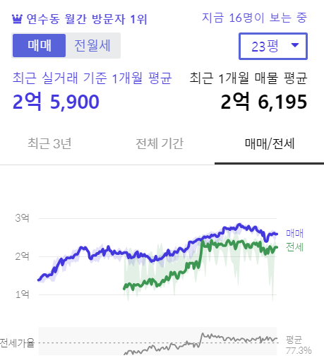 임장 당시 매매가 2억 7천, 갭투자금 3천정도 였으나 송도에 새아파트가 들어서고 재건축도 어려워보여 연수우성2차 23평은 3억이 넘지 않을 것으로 판단했으나 당시 대비 1억넘게 올랐네요.