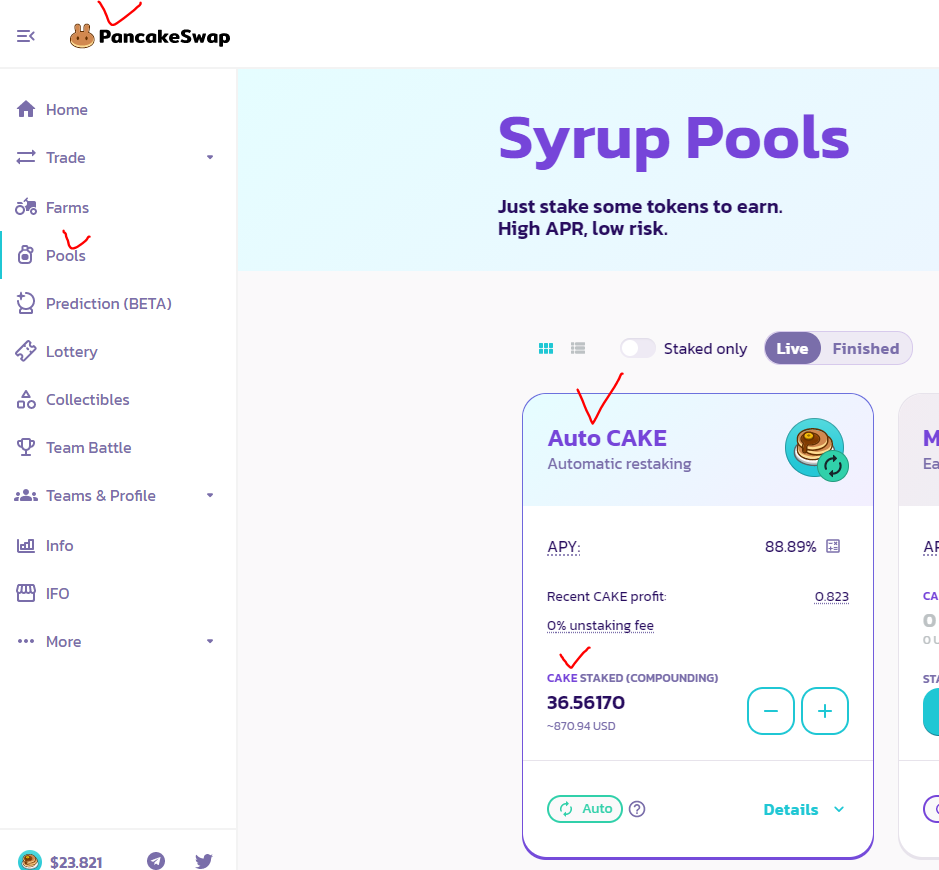 팬케이크스왑 --> Pools --> Auto CAKE에 코인을 스테이킹(Staking)했음.