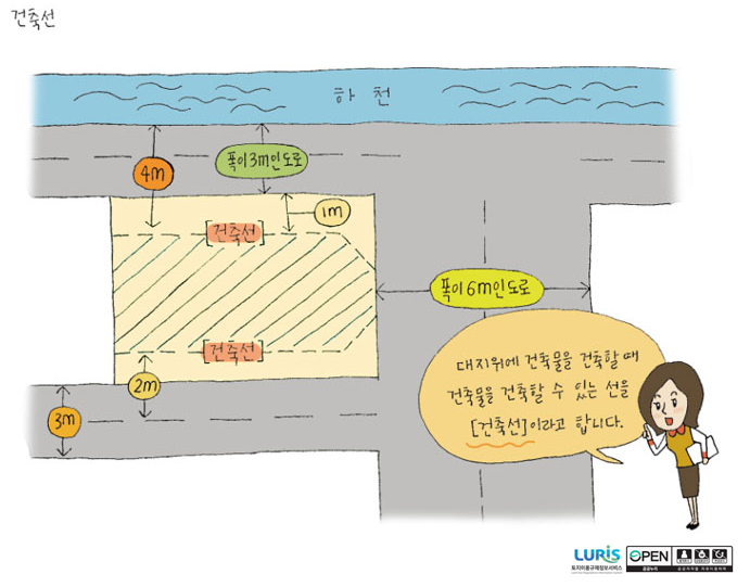 ==> 건물을 지을수 있는 대지와 도로의 경계선을 건축선이라고 하며, 이 건축선 안에서만 건물을 지을 수 있다.