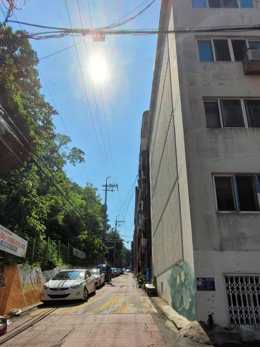 길 하나를 두고 양 옆으로 빌라들이 빽빽히 들어서 있음