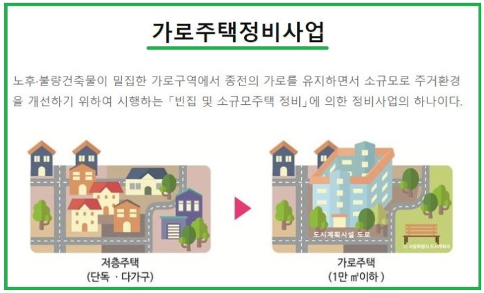 가로주택정비사업은 노후·불량건축물이 밀집한 가로구역에서 종전의 가로를 유지하면서 노후주택을 소규모로 정비하여 주거환경을 개선하기 위한 사업이다.